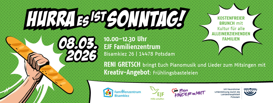 Gemeinsam laden wir in regelmäßigen Abständen Sonntags alleinerziehende Mütter und Väter dazu ein, in entspannter Atmosphäre im EJF Familienzentrum im Schlaatz zu brunchen, während ihre Kinder durch das Team des AWO Büro KINDER(ar)MUT betreut und mit unterhaltsamen Angeboten beschäftigt werden.