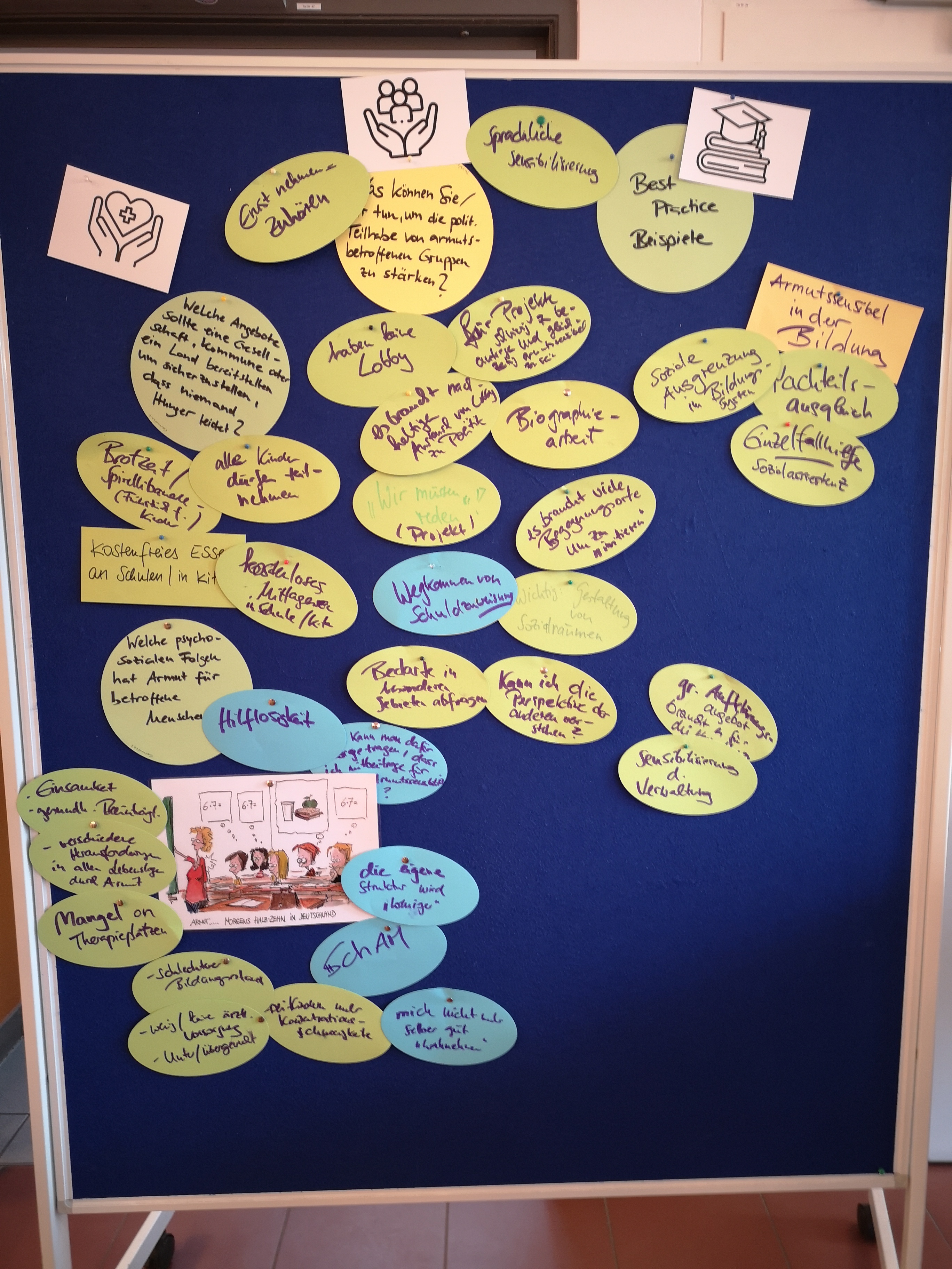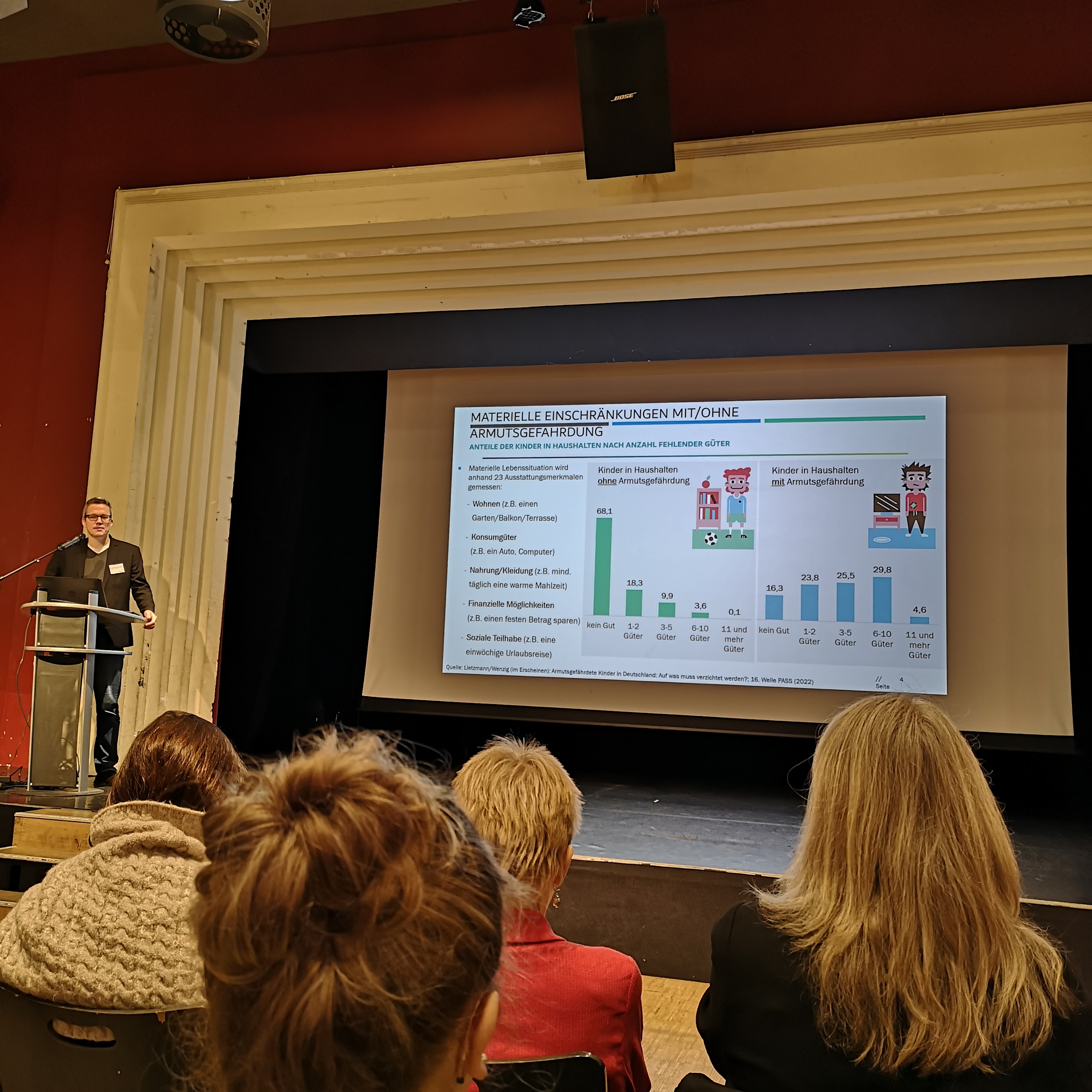 Prof. Dr. Johannes Schütte, Leiter des Instituts für Sozialpolitik und Sozialmanagement der TH Köln, sprach zum Thema „Armutssensibles Handeln in der Arbeit mit Familien, Kindern und Jugendlichen“. Damit griff er ein Thema auf, das später an dem von uns betreuten Thementisch mit den Teilnehmenden weiter besprochen und vertieft werden konnte. Schütte machte in seinem Vortrag deutlich, dass Armut in Deutschland ein konstantes Problem ist. Wobei in den letzten Jahrzehnten eine kontinuierliche Steigerung zu beobachten ist. Kinderarmut ist kein abstraktes Problem, sondern hat reale Auswirkungen auf das Leben der Kinder: ihre materielle, kulturelle, soziale und gesundheitliche Lage ist eingeschränkt. Aufwachsen in Armut bedeutet täglich sozialen Ausschluss: Alltägliche Dinge wie Sportvereine, Schwimmkurse oder Kino- und Zoobesuche werden oft unerschwinglich. Am Beispiel der Wahl eines in die Kita mitgebrachten Geburtstagskuchens zeigte er auf, dass bereits kleine Dinge, die selbstverständlich erscheinen, viel über die finanzielle Situation einer Familie aussagen. Kinder merken früh, wie viel Geld die Familie hat, ziehen sich häufig sozial zurück, weil Armut ausgrenzt und beschämt.