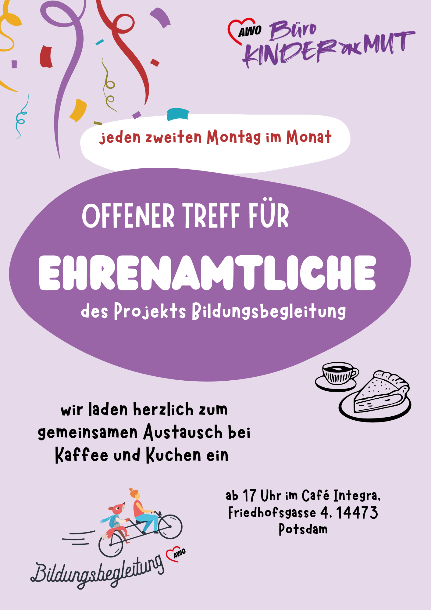 hiermit lädt euch das AWO-Büro KINDER(ar)MUT herzlich zu einem offenen Treff für Ehrenamtliche des Projekts Bildungsbegleitung ins AWO-Café Integra ein.