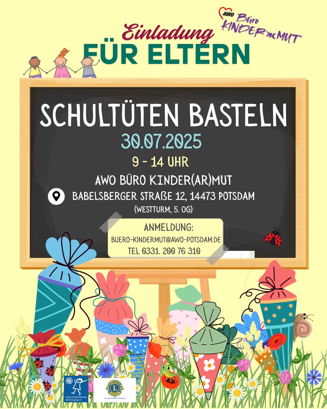 Mittwoch, den 30.07., von 9 – 14 Uhr im AWO Büro KINDER(ar)MUT Babelsberger Straße 12, 14473 Potsdam, Westturm, 5. OG